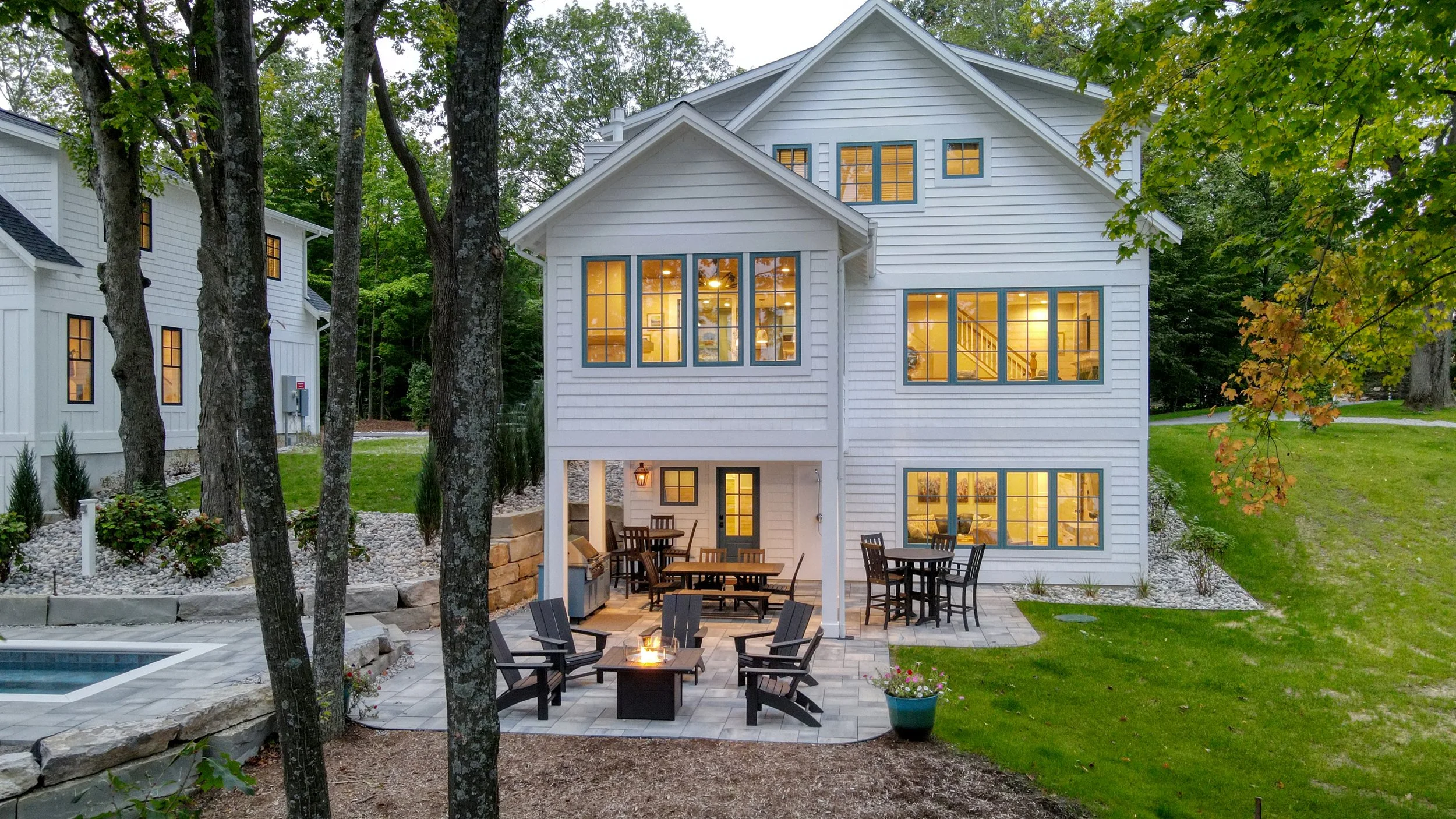 During your stay, you’ll have access to: outdoor hot tubs, sauna + cold plunge, fire pits for evening connection and peaceful lakefront spaces for reflection